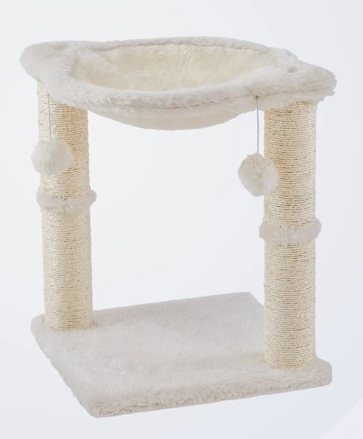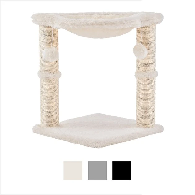 If you want to give your kitty a spot of his own, but don’t have room for a colossal cat tree, then the Frisco 20-Inch Cat Tree is the ideal solution. It’s just big enough for your cat, and compact enough to fit in any room or out-of-the-way corner. This stylish cat tree has a sleeping hammock on top where your kitty can curl up and snooze the day away. Plus, it gives him a spot to watch over his sprawling indoor kingdom. The nap area and the base are covered in a thick plush material that’s cozy and soft to the touch. Two pillars wrapped in natural sisal rope give your cat an appropriate place to stretch and scratch. And the dangling pom-pom toys are sure to appeal to your feline’s mouse-hunting instincts when it’s time to play. With a neutral ivory color, it fits right in with your home décor. This fashionable cat tree is recommended for kittens and small cats to enjoy.