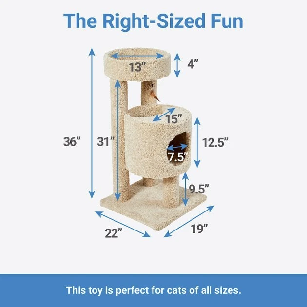- Features a tall, round platform to give your cat a place to perch and a cozy condo for a little extra privacy.