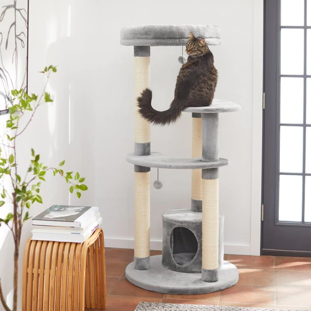 The Frisco 59.5-in Faux Fur Cat Tree & Condo brings high-rise living to your feline friend! It has lots of kitty favorites, including four sisal-wrapped scratching posts, a roomy condo, dangly pom-pom toys, two platforms and an elevated penthouse perch where they can survey their home in comfort. The whole tree is covered in soft faux fur that kitties love to rub against and nestle up in. The high perch offers absolute kitty comfort with a removable, machine washable cover and soft bolsters they’ll love to curl up in over and over again. Plus, to fit your home décor, this tree and condo combo is available in light, neutral gray and dark charcoal colorways.