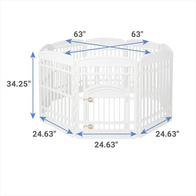 Give your furry friend a safe and secure place to play and lounge with a spacious pen from Frisco! This exercise pen safely keeps your pet enclosed in any indoor area you choose, so they can stretch out in the 18 square feet of play space while you relax knowing your best pal is comfortable and out of trouble. The eight individual panels have an interlocking design that snaps together easily with no added parts, and the secure, double-latch door requires no extra assembly time. Just snap the panels together and relax! This pen has a configurable design, so you can adjust the shape of the enclosure to hold their food and water bowls, plenty of toys and even a comfy bed. Plus, to protect your floors from scratches and scuffs, the panels have non-skid rubber feet that keep the pen in place.