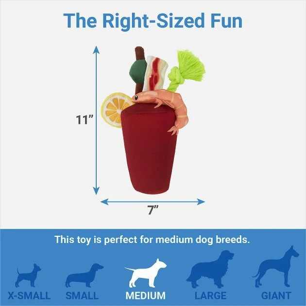 A Bloody Mary is an absolute must at brunch, and it’s about time that your dog gets to experience this mid-day go-to! This super cute plush toy will surely have your pooch ready for brunch-o-clock, expect that instead of boozy it’s squeaky! Watch as they thrash it around, going after the lemon, shrimp and all the other toppings, almost like they’ve seen a certain doggy parent do the same with their own Bloody Mary (wink, wink). As if that wasn’t enough excitement for one afternoon, this plush toy comes with a sewn-in squeaker and crinkle paper to really crank up the fun and give off those brunchy vibes.