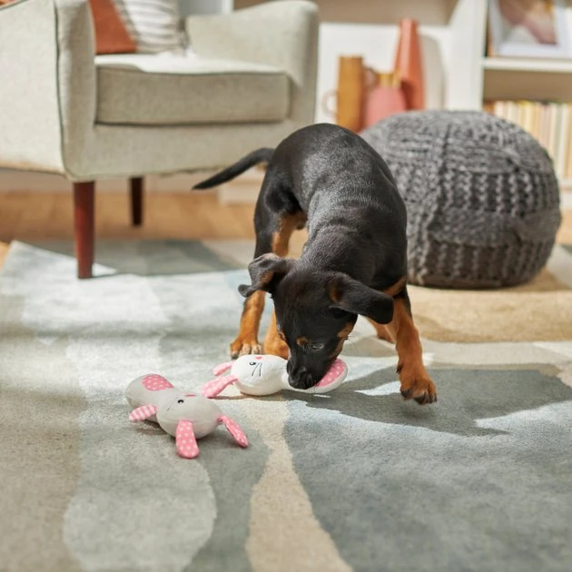 Does your new little buddy need a couple of cuddly friends to play with? This two-pack of bunny toys is just the cuddly bunch for your new best friend. It includes a quality bunny plush toy and a plush bunny ring toy, each with an exciting squeaker puppies love and a soft, fuzzy cover with squishy stuffing, too. With all this, these toys are just as play-worthy as they are cuddleable and cute, just like your new pup! Frisco by Chewy has you covered with all the essentials for a happy pet, from potty supplies to apparel, toys, beds, dinnerware, leashes and collars and lots more.