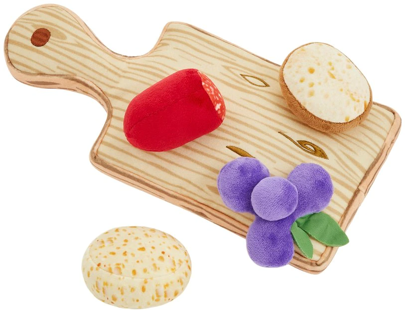 Charcuterie for your cutie? Surprise your bestie with this plush interactive charcuterie board toy. It features a plush, squeaky board with removable salami, cheese, crackers and grapes. Each removable toy has a built-in squeaker to get your pup extra excited. This squeaky snack spread is a playtime must-have!
