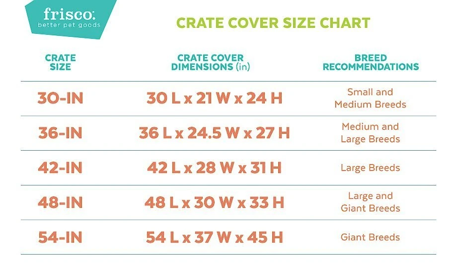 The crate cover is designed to fit Frisco crates but will fit most 30-inch, 36-inch, 42-inch, 48-inch, and 54-inch single or double door wire crates. To ensure a perfect fit, we recommend measure the exterior length, width and height of your crate and comparing the measurements of your crate to the size chart.