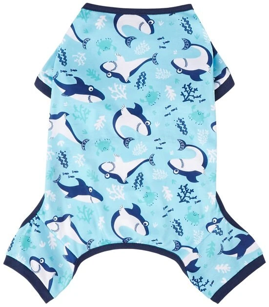 Remember to measure your pet for the paw-fect fit. Your pet can feel like their swimming in coziness with the Frisco Happy Shark Dog & Cat Jersey PJs. These lightweight pajamas are made with a soft 100% polyester material that makes them great for everyday wear. Whether your pal is all about catnaps or slumber parties, these snug-fitting PJs are comfy to slip on and jump into playtime! With this cute shark pattern, you’ll also want to wear them out around town—just make sure to layer if it’s extra chilly! These PJs are made with a high-quality design, including sleeves with ribbing, and an easy-to-put-on style that’s great for dogs and kitties alike. Plus, they also help keep dander from bedding and furniture.