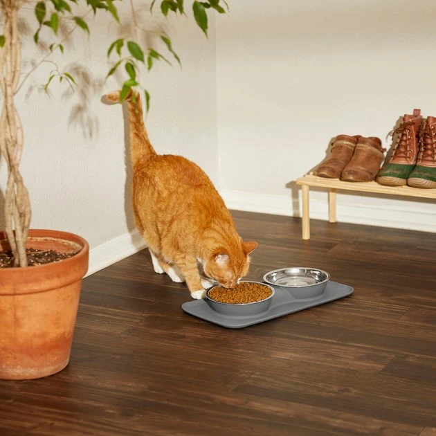 - Features a flat silicone base with a rim to contain food and water messes.