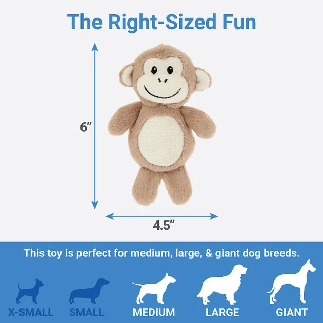 - Plush puzzle toy comes with soft tree and 3 plush squeaky monkeys to retrieve on the regular size, and 6 plush squeaky monkeys on the jumbo size.