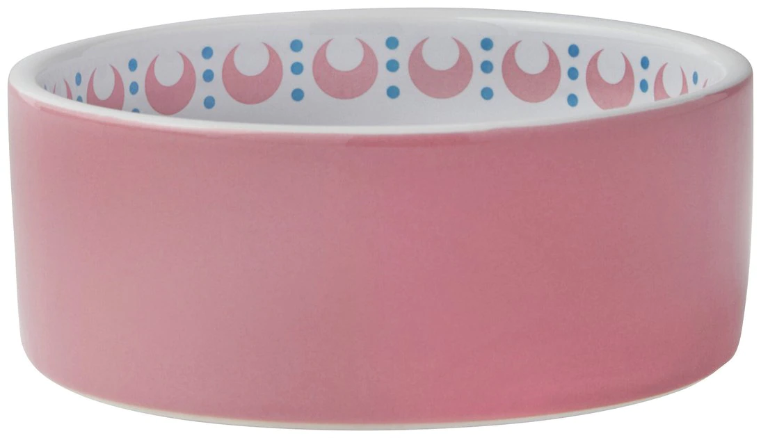 - Bright, poppy ceramic cat dish with solid pink around the outside.