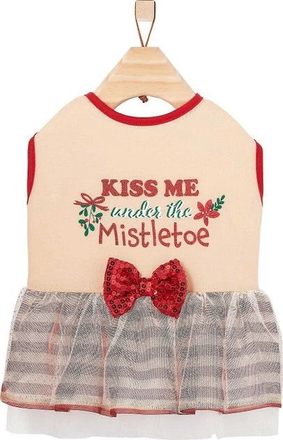 Dress your pet to impress this holiday season! This pullover-style dress is easy to slip on your pet so they can easily go off and strut their stuff all season long. It’s designed with breathable polyester material so your pet can feel comfy while they’re out and about. It features a cute “’Kiss Me Under the Mistletoe” graphic with holly, a red sequin bow and tulle around the skirt for extra festive fashion.