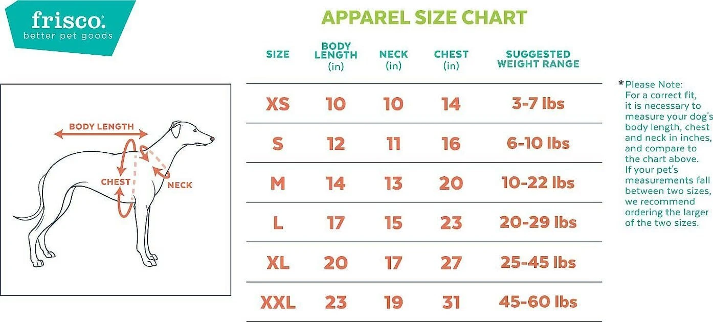 | Size | Body Length | Neck | Chest | Suggested Weight Range |