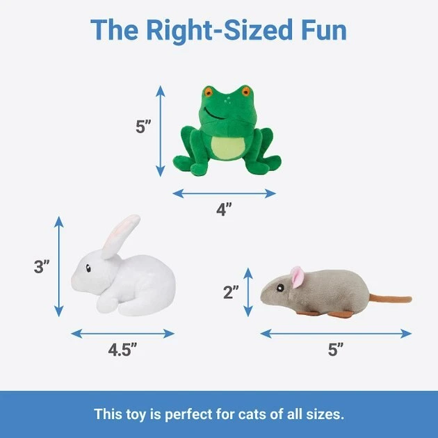 - Plush frog, rabbit and rat toys bring a little magic to your kitty’s favorite games.
