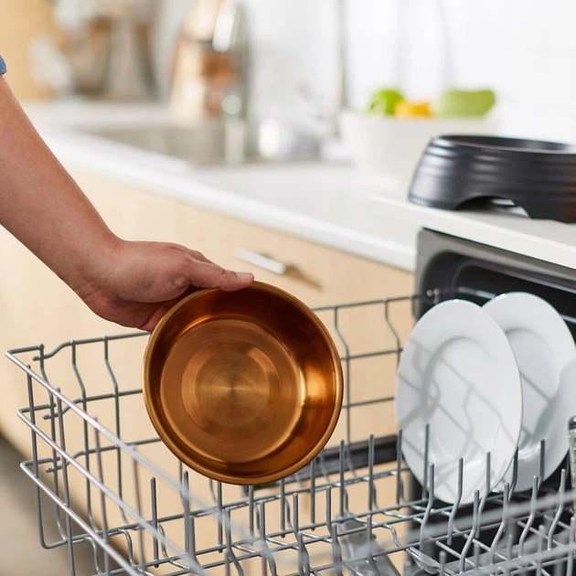 For a distinguished look, this bowl is the top of the line. It includes a removable light copper-colored stainless steel bowl that easily comes out of the matte black melamine base when it’s time to give your dog’s dinnerware a wash. The base has an elegant design that looks great in your home and helps keep their bowl in place to cut down on doggie dinner messes. Available in three sizes, you’re sure to find a bowl that fits your dog’s appetite and your home décor.