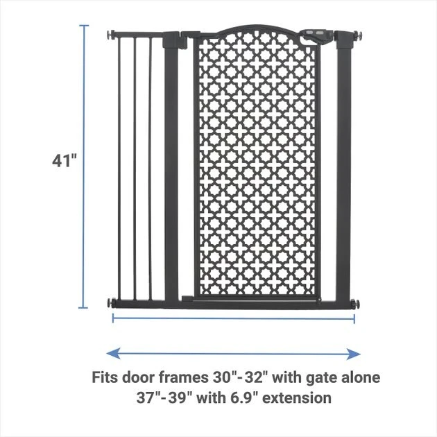 - Measures 41 inches in height and with the included 6.9-inch extension, this gate can fit openings of 30-32 inches and 37-39 inches.