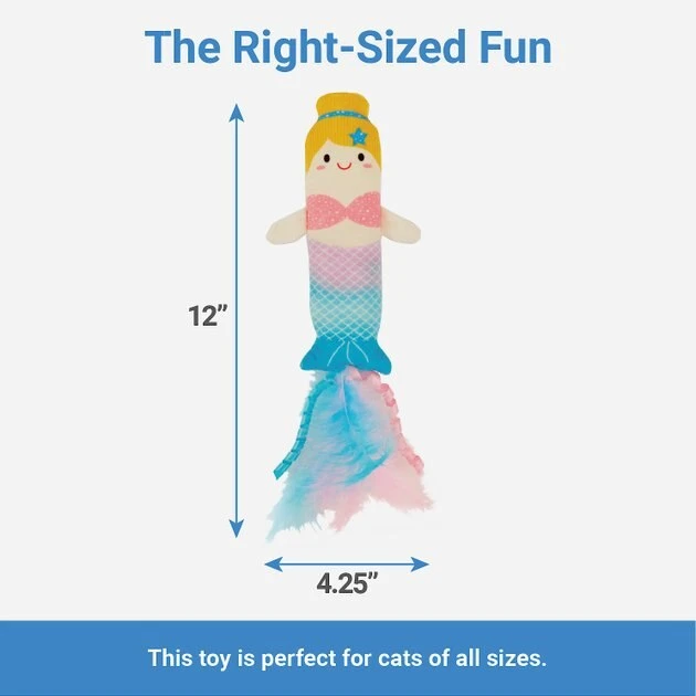 Get ready to make playtime magical! This meow-worthy mermaid provides the best of both worlds—the perfect shape for cats to wrestle and “bunny kick” with their hind paws, and the crinkly sounds that drive them wild. You’ll know it’s your feline’s fave when you see them carrying it around the house. The furry tail adds motion to stimulate your kitty’s hunting instincts, so toss it to give them the thrill of the chase. It’s also spiked with USA catnip for even more exciting play.