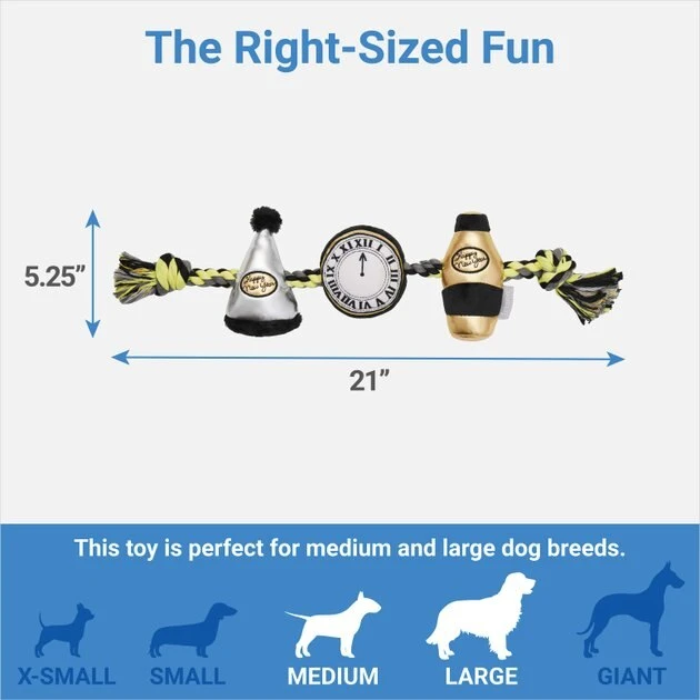 It’s New Year’s Eve and your dog’s clock is tick, tick, ticking down to the ball drop! There’s no better way to ring in the new year than with gifts, and your lucky dog’s got three of them! Sparkling party hats, champagne bottles—this plush rope toy set has everything to pump up the party. Watch your dog chase after, fetch and pop champagne for the new year and well beyond—and don’t be shy, you can join in on the fun, as well, making this a perfect gift for interactive play.