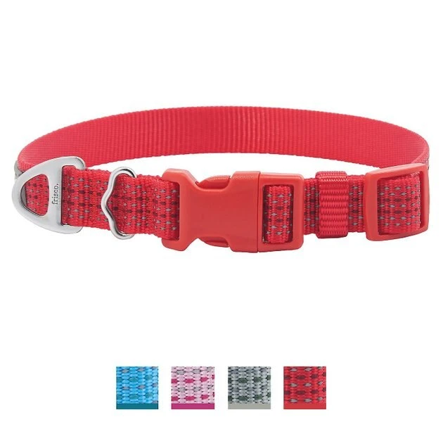 Explore the great outdoors with this Frisco Outdoor Frisco Nylon Collar, Flamepoint Orange, Small-Neck: 10-14-in, Width: 5/8-in + Rope Leash With Padded Handle, Sunset Orange, 6-ft bundle! The quality, durable collar is made with ultra-reflective nylon webbing for low-light conditions, keeping your dog visible, and making dusk and nighttime walks safer. It also features a lightweight buckle, a D-ring for leash attachment and a separate tag ring too. Attach the included leash using the lobster clip. This leash is just like a classic rope leash with durable, secure nylon rope with ultra-reflective accents to increase your dog’s low-light visibility. That means safer dusk and nighttime walks. The loop handle has extra padding, so it feels great wrapped around your wrist or in your hand. This bundle is grrr-eat for all your outdoor ex-paw-ditions!