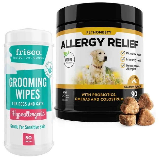 - Comes with a 50-count tub of Unscented Frisco Hypoallergenic Grooming Wipes with Organic Aloe for Dogs & Cats and a 90-count container of PetHonesty Allergy Relief Snacks Immunity Strength & Digestive Health Soft Chews Dog Supplements.