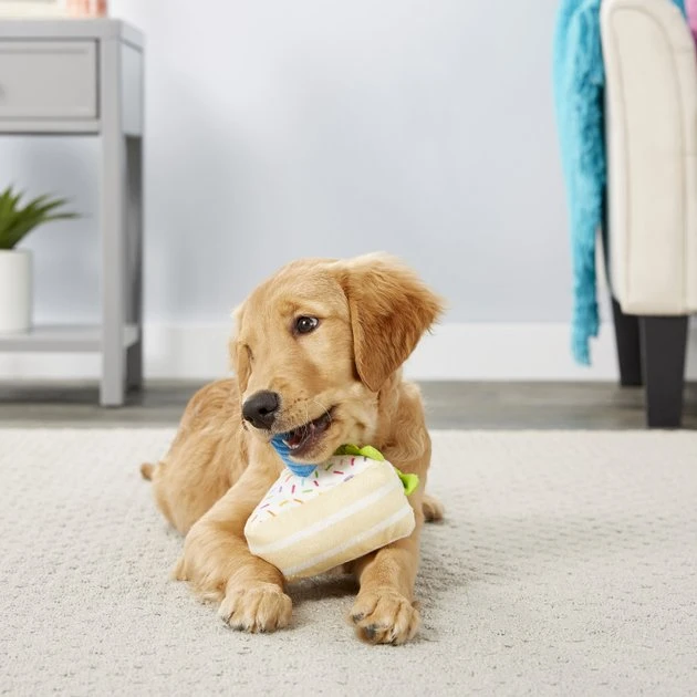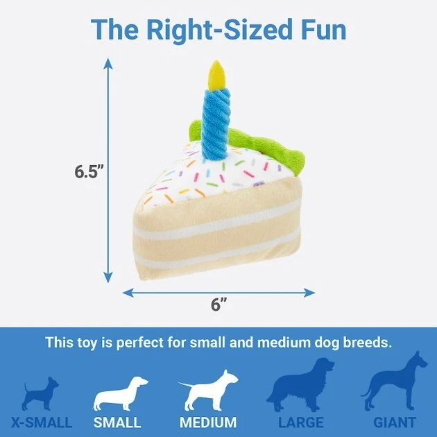 It’s your pet’s birthday so let them squeak cake! This plush cake squeak toy turns up the excitement with a built-in squeaker to get the party started. Made with a soft fabric, it’s the perfect snuggle buddy for naps too. Who doesn’t want to cozy up with a nice slice of cake to themselves, anyway? Toss it, squeak it, make a wish. Sweet! Now there’s so many ways to celebrate your pup’s special day or adopt-a-versary, complete with icing, sprinkles and a candle on top.