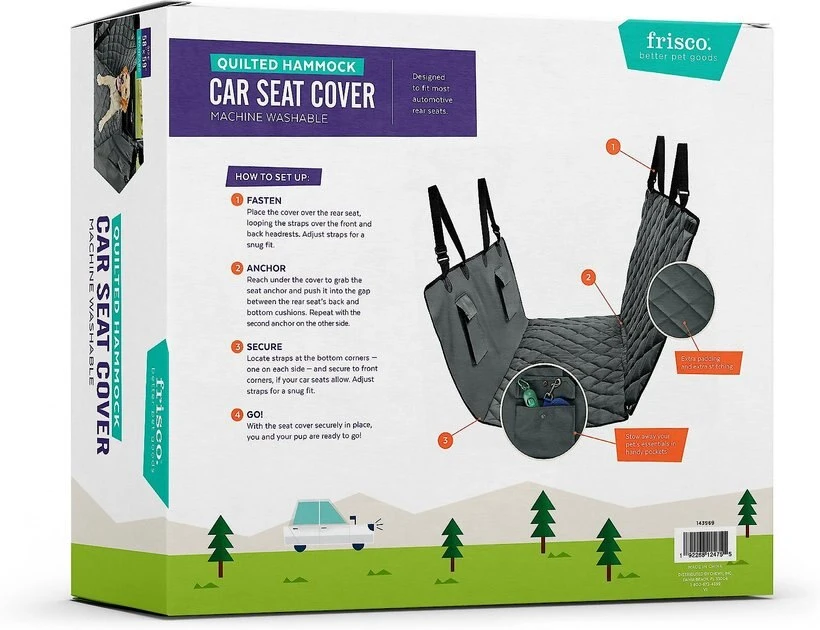 Always say yes to bringing your pal along on all your car trips with the Frisco Water Resistant Hammock Car Seat Cover. Made of quilted, heavy-duty Oxford polyester, this cover provides protection for your car seats and floors from water, spills, stains and color-bleeding—while being comfy enough for any-length trip. Keeping your car seats protected from messes means more fun riding around together—from errands to road trips! Designed to fit the back seats of most cars, it’s easy to install in just three simple steps—lay the cover on the seat, loop the straps around all four headrests and adjust for a snug fit, push the anchors through the seat gaps and you’re all set! Plus, it features a non-slip mesh backing, handy storage pockets, closeable slits for easy seat belt access, and “seatbelt keepers” to hold the seat belt out of the way. It’s also machine washable for hassle-free cleanup.
