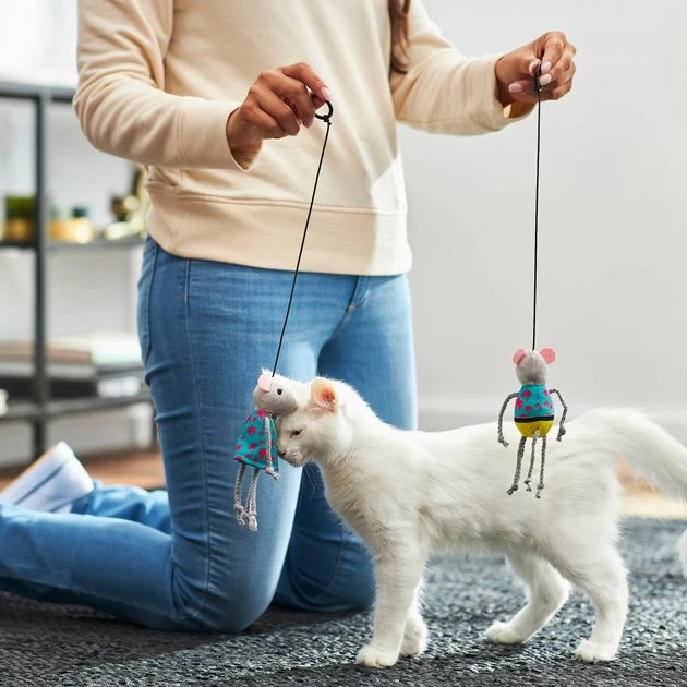 - Connected to a bouncy string so you can have some interactive fun with your cat.