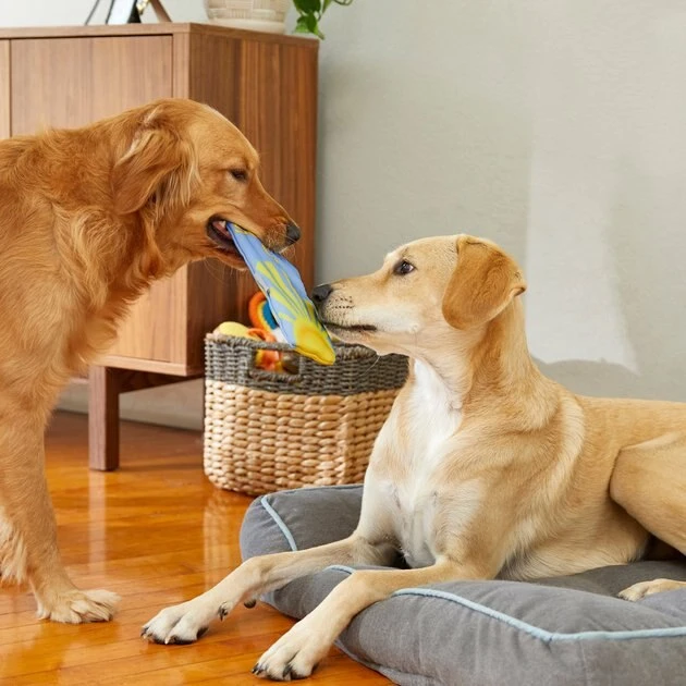 Hang ten with Frisco! This colorful, summerful surfboard design is perfect for dogs who love to play out in the sun with their people, and it’s made from ballistic nylon with minimal stuffing and crinkle paper inside so it’s great for play and cuddling too. Plus, there are no squeakers inside so your pup can play quietly through all those long, hot summer days. This toy is not only soft and cuddleable, it’s also great for all kinds of furry fun like chasing, fetching and catching.