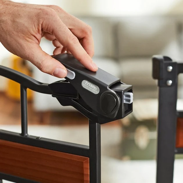 Check out the Size Tab to be sure this gate fits your doorway. Turn any room in the house into a safe zone, and add a little flair too, with the Frisco Wood Accents Extra Tall Auto-Close Pet Gate. Made with a durable all-steel construction and stylish wooden accents, this gate is designed to keep your pet safely contained by simply installing it in a door frame or hallway. The pressure mount system makes setting it up and taking it down easy, so you can move it to different areas of the house as you need. The gate door works double duty by staying open when you need it to—just open it past 90 degrees to lock it open—or otherwise closing on its own. You can also set up the door to open to any side. The dual-lock safety release means your pal can’t get crafty and open the door, adding a layer of security. Plus, this gate is lightweight so you can transport it and store it easily.