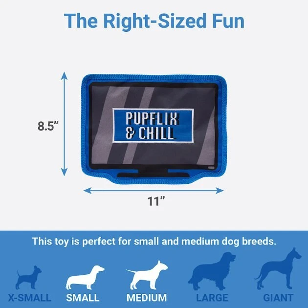 Put playtime up on the big screen with this plush flat screen TV squeaky toy. Perfect for a fun game of fetch, plus it includes a built-in squeaker for extra excitement. It features a cute TV screen design and you can flip it over to read the definition of “Pupflix” on the back. Your pup will love binging these episodes of playtime.
